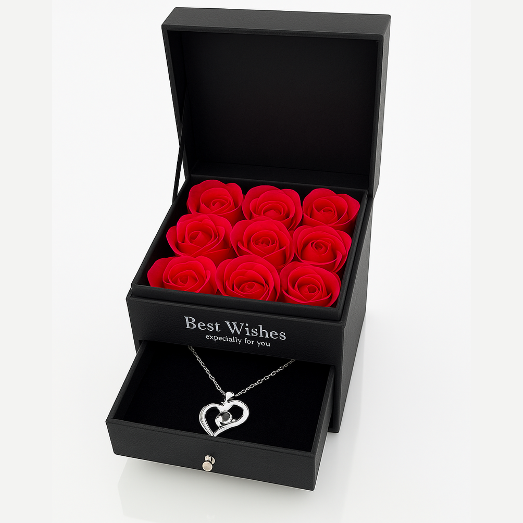 Pour sublimer l’expérience, le coffret inclut un collier en forme de cœur gravé avec la phrase “Je t’aime” dans 100 langues. Conçu en acier inoxydable, il est à la fois élégant et durable, et complète parfaitement les roses éternelles pour faire de ce coffret une véritable déclaration d’amour.
